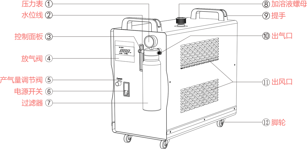 注意:當產(chǎn)氣速度調節(jié)到最低時,水焊機的耗電量最小、產(chǎn)氣量最小,火焰輸出最小。反之則輸出增大。